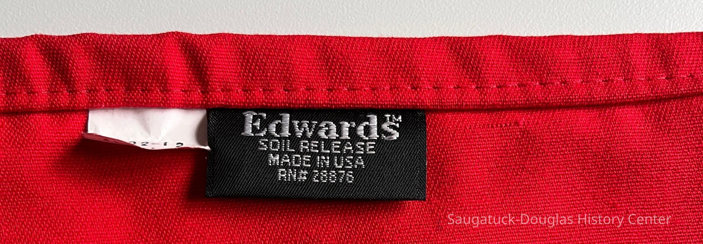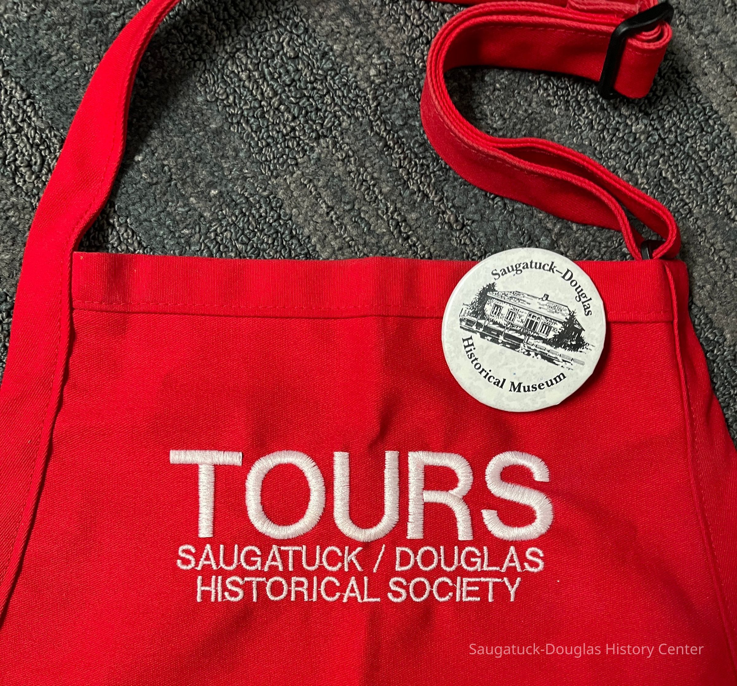 Red, polyester fabric apron with three pockets and "Tours Saugatuck/Douglas Historical Society" embroidered on the front in white thread.