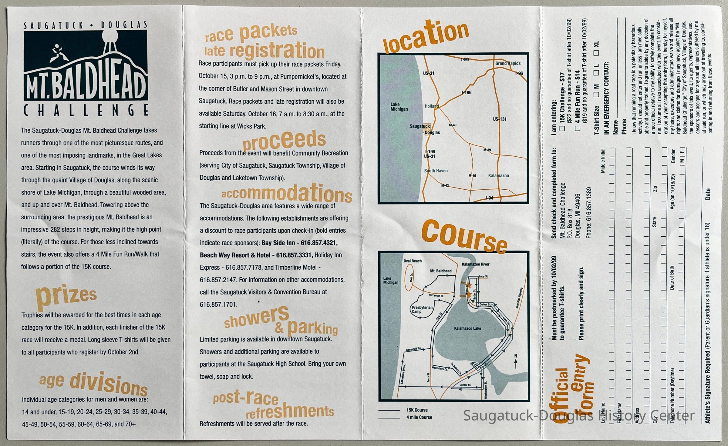 4-fold, self-mailing brochure with information about the 1999 Mt. Baldhead Challenge 15K race and 4 mile fun run/walk with information about the dune, sponsor service, description and map of the course, prizes, age divisions, registration, proceeds, accommodations, showers, parking, refreshments and the entry form. Printed on white paper with green and goldenrod ink