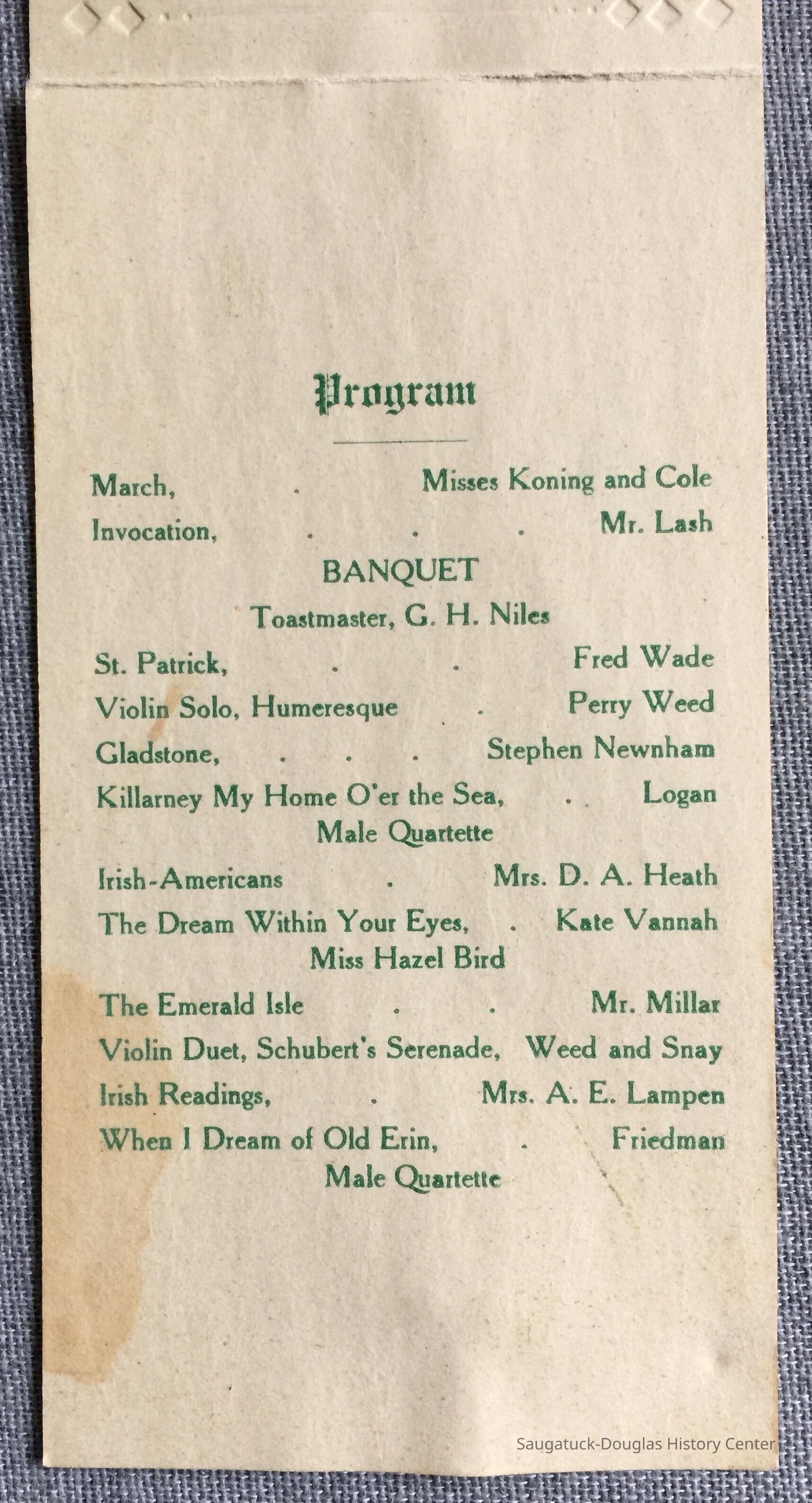 The inside of the card lists the musical selections and performers for the banquets entertainment which had an Irish and/or St. Patrick's Day theme.