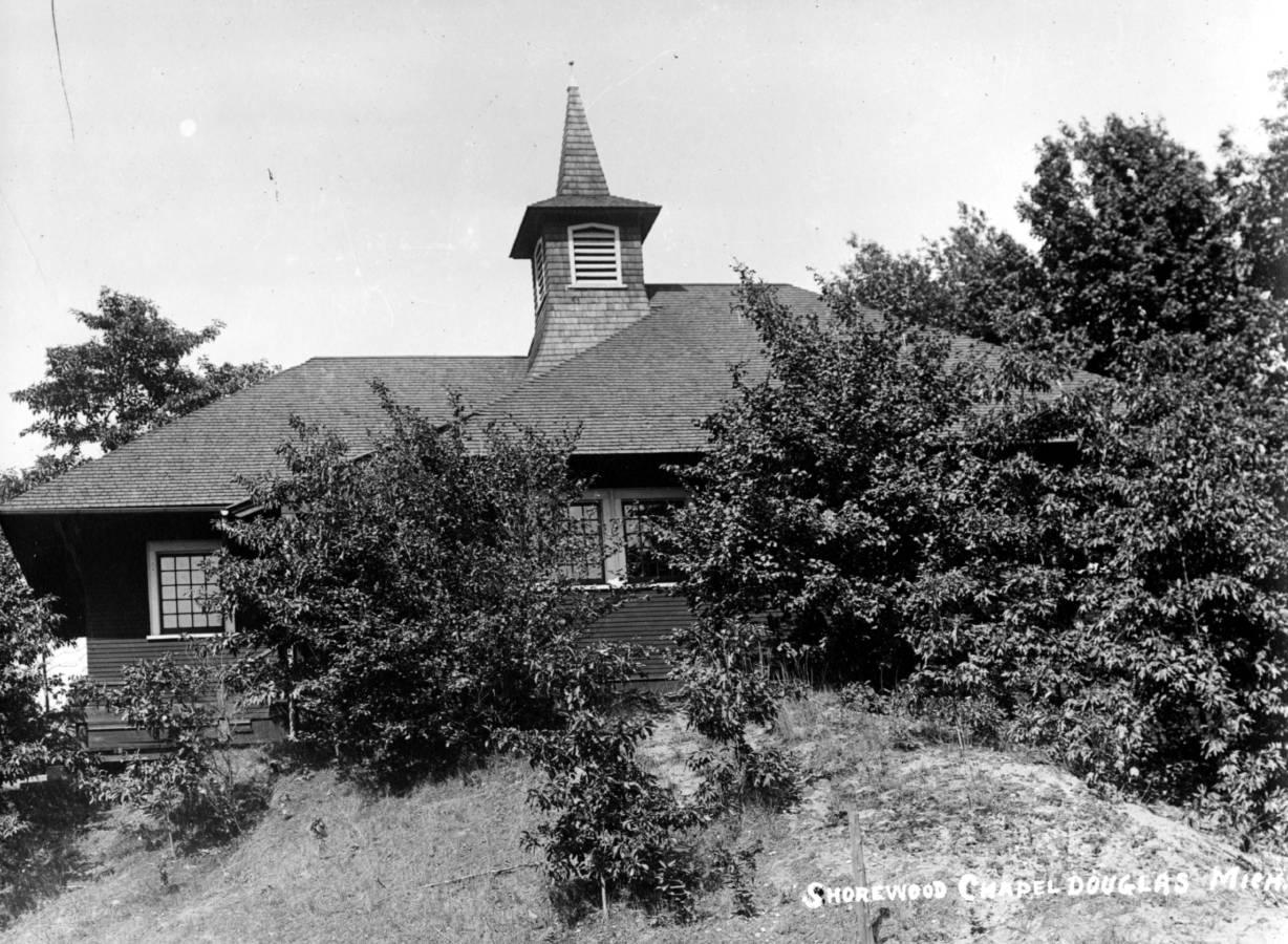 This chapel was the outgrowth of a Douglas lakeshore Sunday School begun by a beach-mom from Oak Park, Illinois. The children of the School collected enough pennies for the Chapel to cover about half its cost. The architect was a young Oak Park architect who studied with Frank Lloyd Wright and appears to have collaborated with Wright on this project. The very simple wood structure reflects the cottagers desire for a structure that reflects the surrounding landscape. It continues today as a non-denominational chapel.