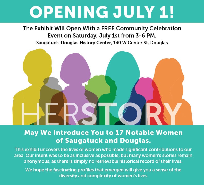 The SDHC exhibit HerStory: Women’s History in Saugatuck-Douglas will be the first of its kind for this community. For more than 30 years the History Center has presented award-winning history exhibits with a topical and regional focus. Now, a volunteer team of women HerStorians has researched, curated, and designed the first exhibit to focus attention on the lives and experiences of women at the Lakeshore.