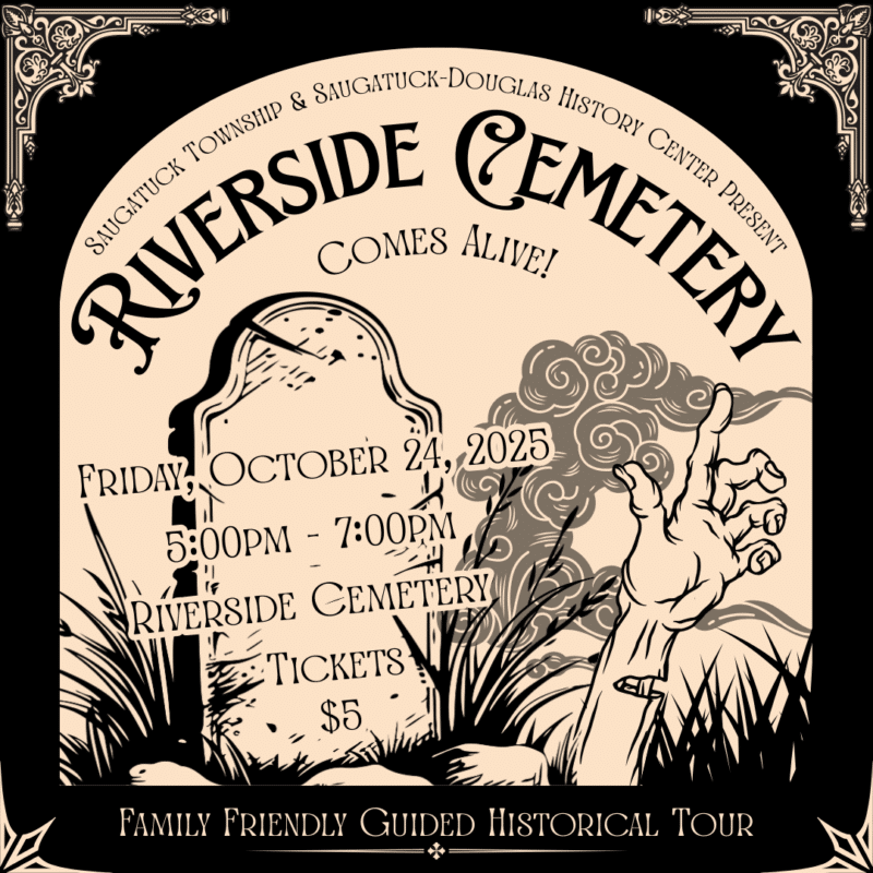 This family-friendly event featured a guided historical tour of Riverside Cemetery, accompanied by living history presentations along the way, sharing the lives of notable Saugatuck/Douglas historical figures, including Carl and Christina Hoerman, William Butler, the Morrison family, and more. Enjoy cider and donuts in the cemetery’s Caretaker’s Cottage.