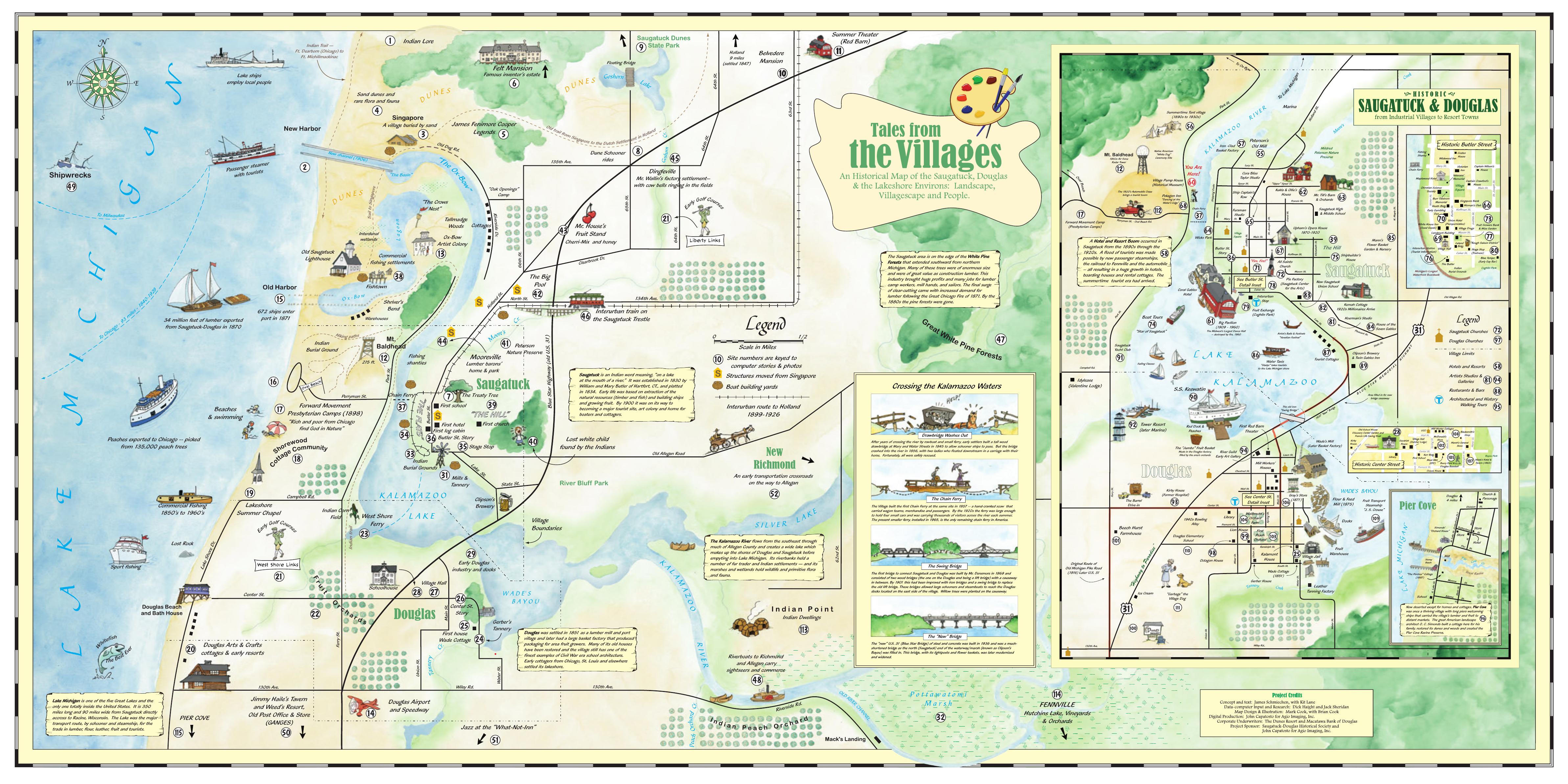 “SuperMap” is a six-foot-high wall map that highlights historic people and places in the Saugatuck-Douglas area. Unveiled in 2008, the original is located in the Museum, and a copy is housed in the History Center. Visitors use an interactive screen to learn about items on the map. On this webpage, you can preview the map and access the related information.