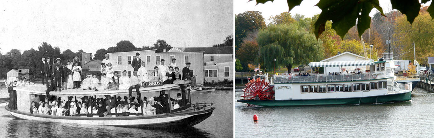 Boat tours have long been a popular attraction for visitors, providing a scenic view of the area from the waters of the Kalamazoo River, Lake Kalamazoo, and Lake Michigan. The 82-passenger Queen of Saugatuck was an authentic stern-wheeler, built for Bruce Starring of Saugatuck in 1978 by John and Jim Shashaguay at their Allegan Road workshop, and based on an earlier design by Dick Hoffman. In 1992 the name was changed to the Star of Saugatuck; the vessel remained in service until 2000, when the larger 150-passenger Star of Saugatuck II, also a stern-wheel paddleboat, was launched. In 2002 a 28-passenger former WWII amphibious vessel known as the “Saugatuck Duck” began giving local tours over land and water.