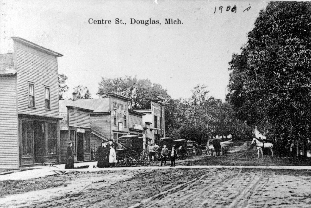 Early Center Street, Douglas, about 1900, looking west up the hill toward the School House (not shown) from Main Street, showing the business block, with carriages and plank sidewalk.