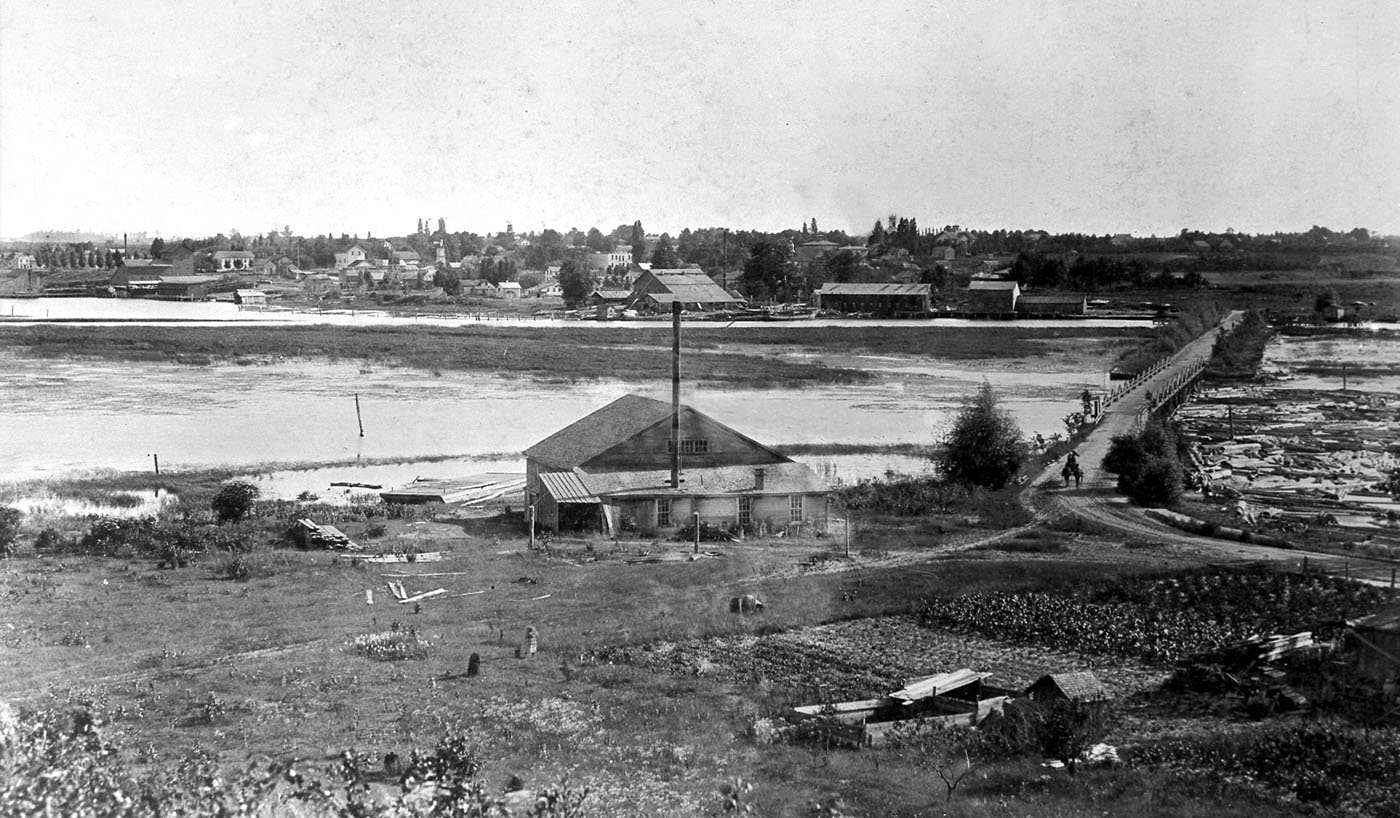 This photo shows, right to left, the new bridge (1869), Douglas Union School (top, right), Douglas Basket Factory (formerly Wade’s Mill (to left of bridge), Dutcher Lodge/Village Hall, boxed windmill (Center and Main Streets), Douglas House Tavern and Hotel (formerly Wade’s/Eagle Tavern), waterside docks and warehouses, and (top left) Gerber Tannery. Gerber & Moore flour mill (at waterfront) was destroyed by fire in 1891.