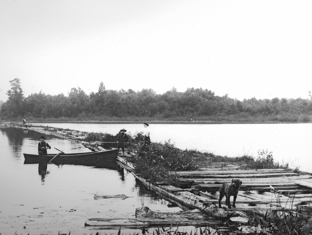 There were five Goshorn brothers from Pennsylvania who arrived in the early 1850s on the shores of what was soon known as Goshorn Lake. The oddly shaped lake, is nestled in the dunes just north of Saugatuck and is well known for its deep center section and steeply dropping off bottom. One step off the beach will put a small child over their head along some of its shoreline, in two broad steps an adult will encounter the need to swim. The lake, with its soft dune shorelines, lies directly across the shortest route from Saugatuck to Holland, so in 1867 money was raised by taxes in both Laketown and Saugatuck Townships to built a floating bridge across the west arm of the water. By 1890 the logs that formed the causeway were so waterlogged that a passing wagon sank up to the axles, with the water nearly touching the bellies of the horses. The tattered bridge remained a fishing venue until 1915 when most of the structure was removed.