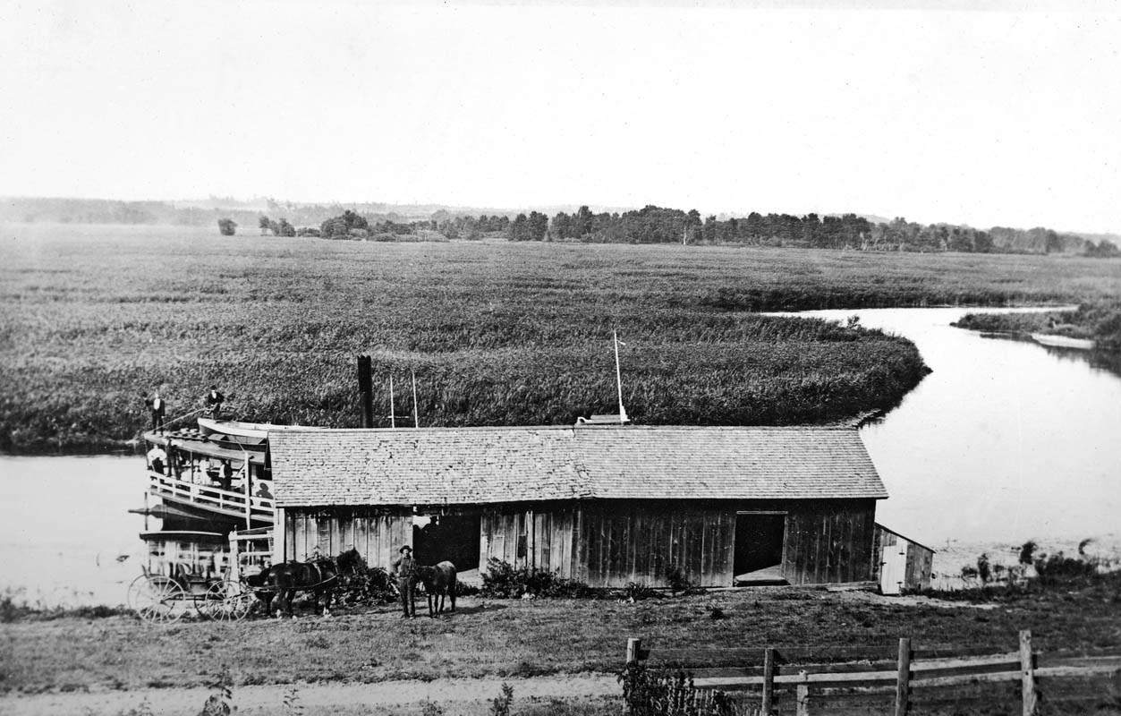 Mack’s Landing is a flat spot the same location on the bank of the Kalamazoo River, near present day 62nd Street and Riverside Road. It was the site of a fur trading post (ca. 1825) operated by Louis Campau who later founded Grand Rapids. It is named after a later owner, James McCormick, a fisherman and fur trader who kept his canoe at this site in the 1830s. It later became an important logging post and a shipping point for tanbark and fruit for local farmers, including Philetus Purdy, whose farmhouse is shown. A nearby school was named Mack’s Landing School. The main river channel now bypasses this landing.