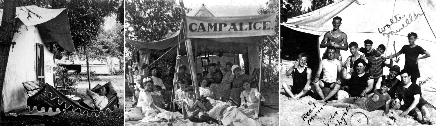 The 1890s brought a new back-to-nature leisure space into existence: the tent and the campground for young and old. By the early 1900s the wooded sand dunes between the Kalamazoo River and Lake Michigan had become a virtual “white city” of camp tents. Camping areas along Park Street and Lakeshore Drive acquired wooden platforms upon which large tents were erected each spring, often for a particular family. Many of these platforms later came to serve as the floor of a permanent cottage.