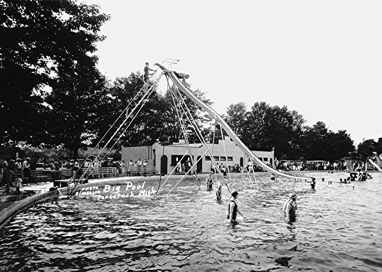 Said to be the second largest swimming pool in the United States, the Big Pool was built by Robert Marriot, a Chicago summer resident of Saugatuck. It had a Spanish style bathhouse and a gigantic water slide. It was expensive to operate and began to lose its clientele when the Village opened its public ’Oval Beach’ in 1936 and closed about 1940.
