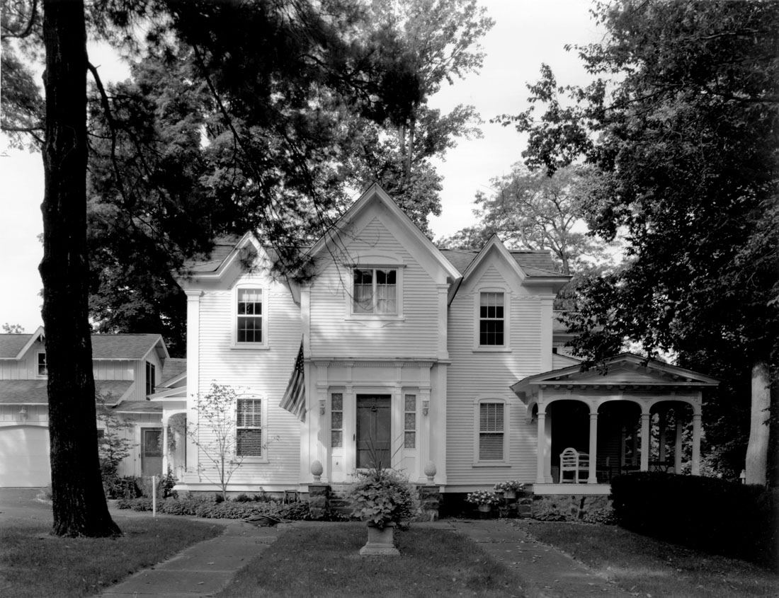 A village landmark, the original house was a folk-Gothic farmhouse with tall gables looking out over a pleasant lawn, getting its name from a set of large lion sculptures at its street entrance. The house was given a Colonial Revival update and additions by a new owner in the 1930s—at the same time the adjacent carriage house (with a ballroom) was converted into a separate residence.